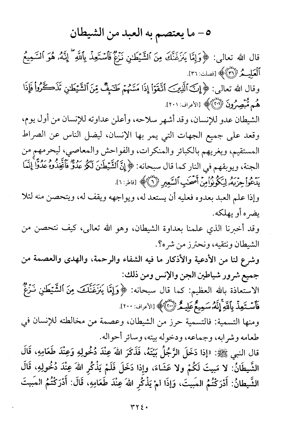 ومنها التسمية: فالتسمية حرز من الشيطان، وعصمة من مخالطته للإنسان في طعامه وشرابه، وجماعه، ودخوله بيته، وسائر أحواله.