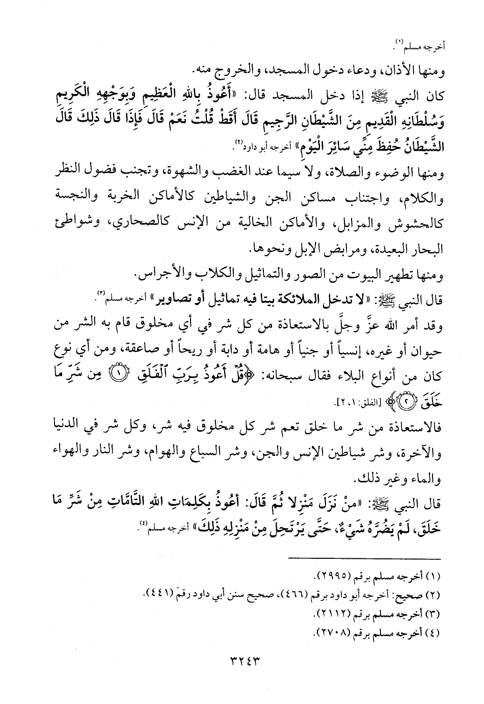 قال النبي - صلى الله عليه وسلم -: «منْ نَزَلَ مَنْزِلا ثُمَّ قَالَ: أعُوذُ بِكَلِمَاتِ اللهِ التَّامَّاتِ مِنْ شَرِّ مَا خَلَقَ، لَمْ يَضُرَّهُ شَيْءٌ، حَتَّى يَرْتَحِلَ مِنْ مَنْزِلِهِ ذَلِكَ» أخرجه مسلم (¬4).