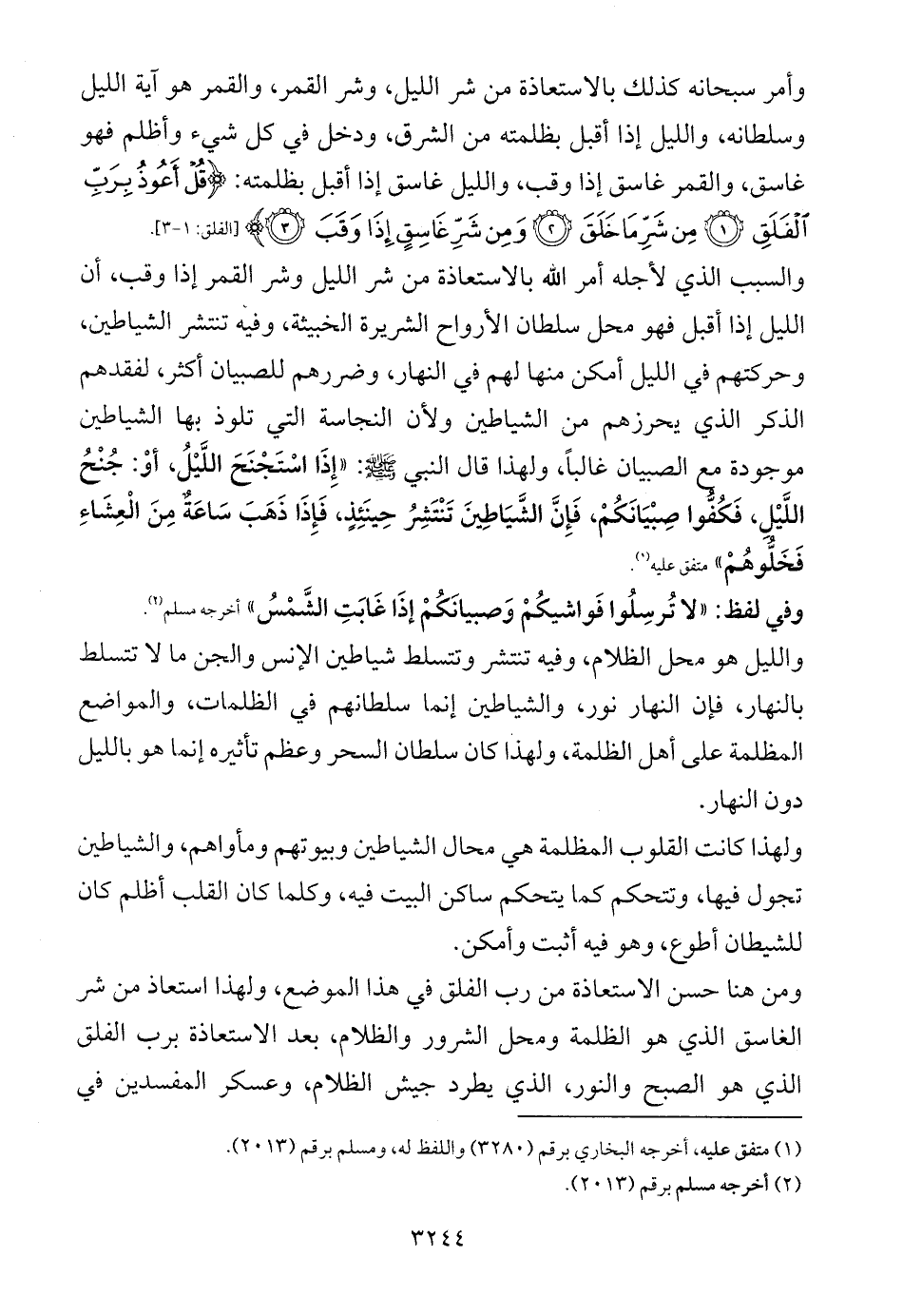 والسبب الذي لأجله أمر الله بالاستعاذة من شر الليل وشر القمر إذا وقب، أن الليل إذا أقبل فهو محل سلطان الأرواح الشريرة الخبيثة، وفيه تنتشر الشياطين، وحركتهم في الليل أمكن منها لهم في النهار، وضررهم للصبيان أكثر، لفقدهم الذكر الذي يحرزهم من الشياطين ولأن النجاسة التي تلوذ بها الشياطين موجودة مع الصبيان غالباً، ولهذا قال النبي - صلى الله عليه وسلم -: «إِذَا اسْتَجْنَحَ اللَّيْلُ، أوْ: جُنْحُ اللَّيْلِ، فَكُفُّوا صِبْيَانَكُمْ، فَإِنَّ الشَّيَاطِينَ تَنْتَشِرُ حِينَئِذٍ، فَإِذَا ذَهَبَ سَاعَةٌ مِنَ الْعِشَاءِ فَخَلُّوهُمْ» متفق عليه (¬1).