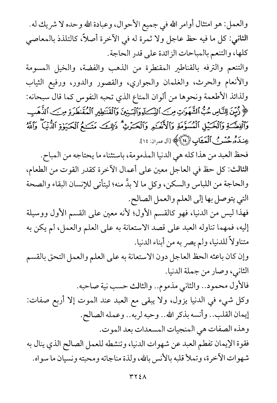 الثالث: كل حظ في العاجل معين على أعمال الآخرة كقدر القوت من الطعام، والحاجة من اللباس والسكن، وكل ما لا بدَّ منه؛ ليتأتى للإنسان البقاء والصحة التي يتوصل بها إلى العلم والعمل الصالح.