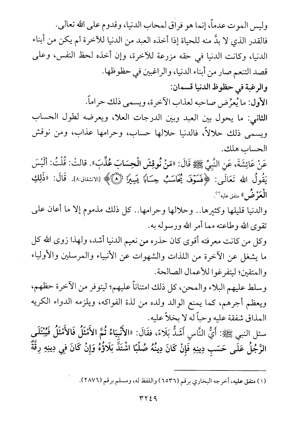 الثاني: ما يحول بين العبد وبين الدرجات العلا، ويعرضه لطول الحساب ويسمى ذلك حلالاً، فالدنيا حلالها حساب، وحرامها عذاب، ومن نوقش الحساب هلك.