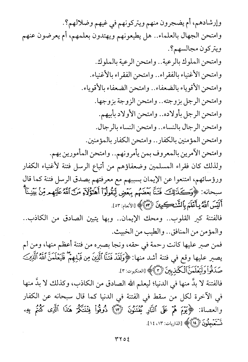 فالفتنة لا بدَّ منها في الدنيا؛ ليعلم الله الصادق من الكاذب، وكذلك لا بدَّ منها في الآخرة لكل من سقط في الفتنة في الدنيا كما قال سبحانه عن الكفار والعصاة: {يَوْمَ هُمْ عَلَى النَّارِ يُفْتَنُونَ (13) ذُوقُوا فِتْنَتَكُمْ هَذَا الَّذِي كُنْتُمْ بِهِ تَسْتَعْجِلُونَ (14)} [الذاريات: 13، 14].