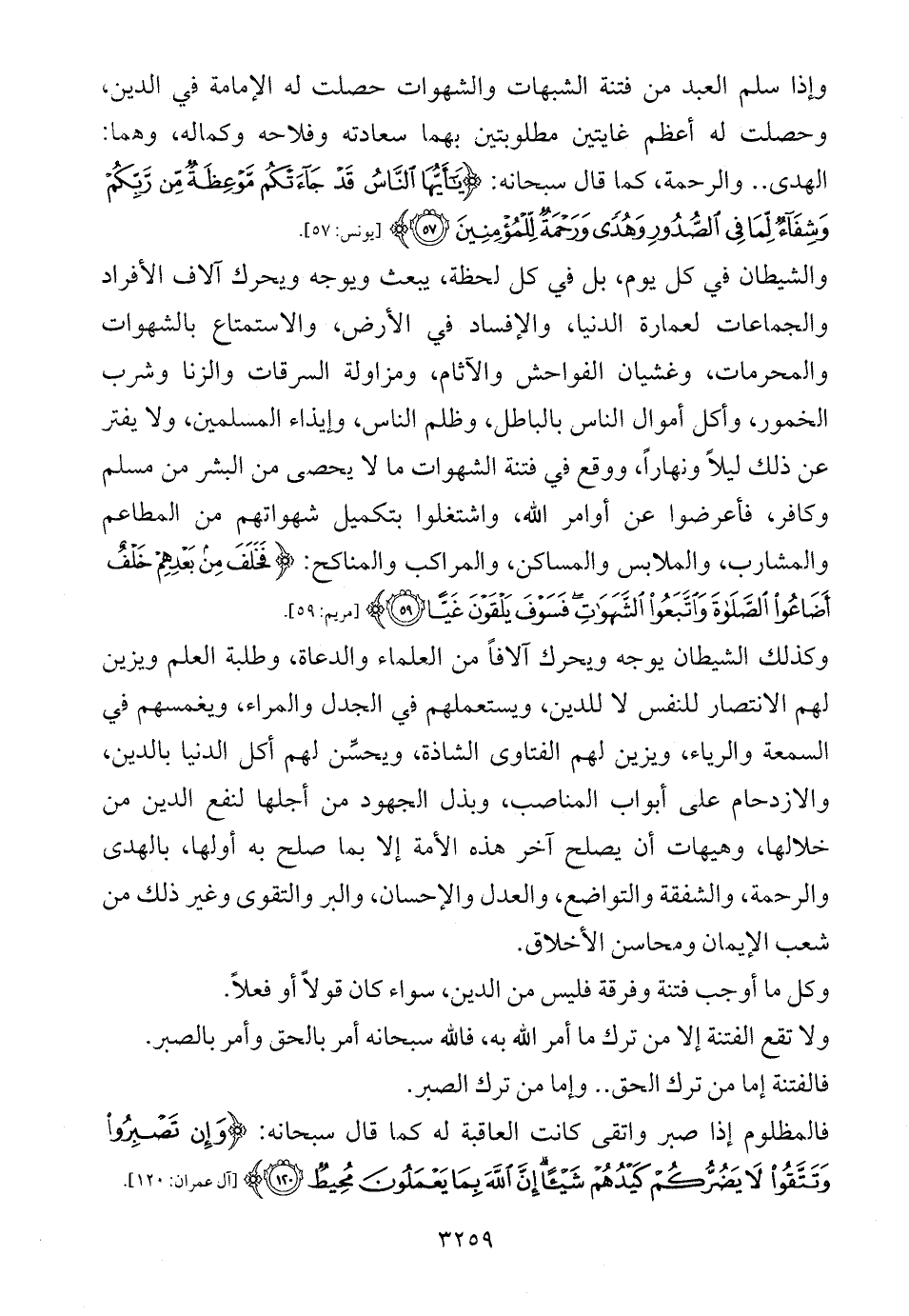 وإذا سلم العبد من فتنة الشبهات والشهوات حصلت له الإمامة في الدين، وحصلت له أعظم غايتين مطلوبتين بهما سعادته وفلاحه وكماله، وهما: الهدى .. والرحمة، كما قال سبحانه: {يَاأَيُّهَا النَّاسُ قَدْ جَاءَتْكُمْ مَوْعِظَةٌ مِنْ رَبِّكُمْ وَشِفَاءٌ لِمَا فِي الصُّدُورِ وَهُدًى وَرَحْمَةٌ لِلْمُؤْمِنِينَ (57)} [يونس: 57].