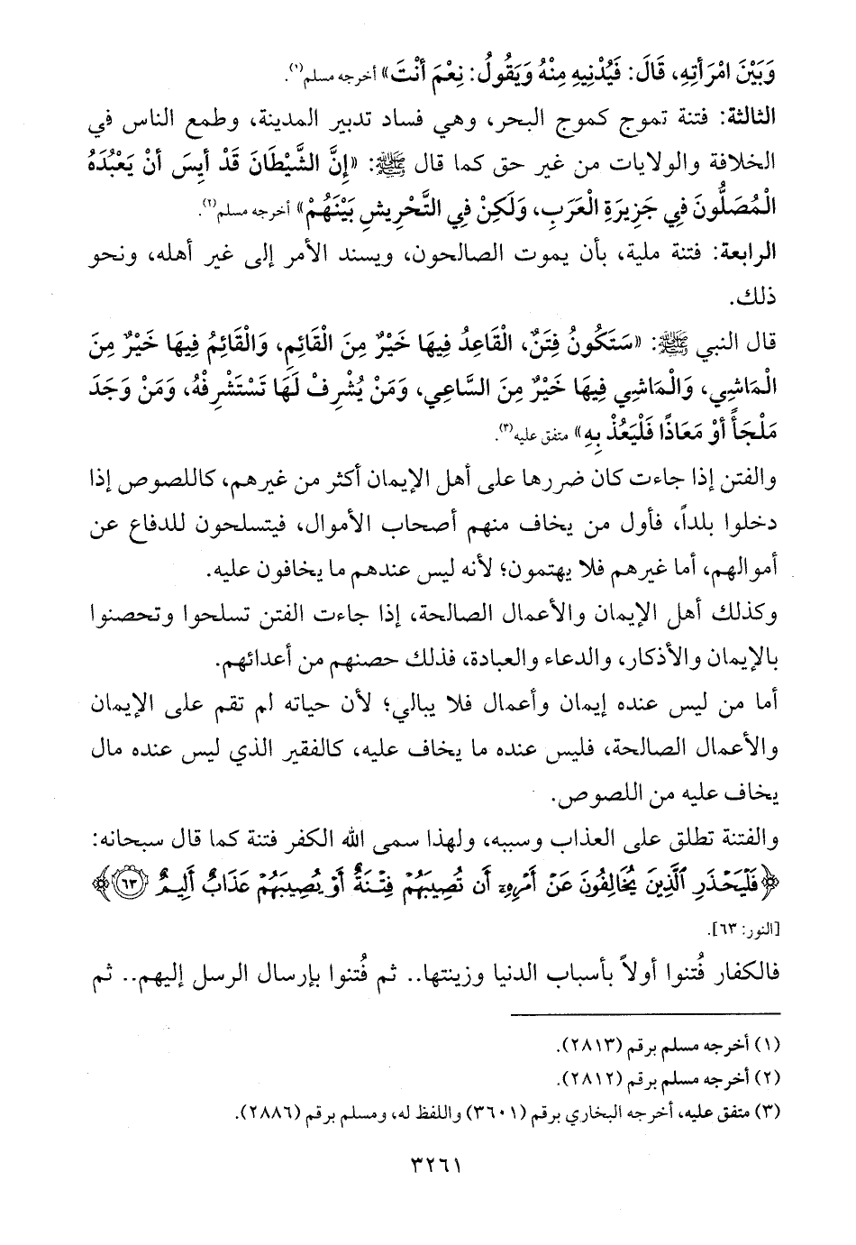 قال النبي - صلى الله عليه وسلم -: «سَتَكُونُ فِتَنٌ، الْقَاعِدُ فِيهَا خَيْرٌ مِنَ الْقَائِمِ، وَالْقَائِمُ فِيهَا خَيْرٌ مِنَ الْمَاشِي، وَالْمَاشِي فِيهَا خَيْرٌ مِنَ السَّاعِي، وَمَنْ يُشْرِفْ لَهَا تَسْتَشْرِفْهُ، وَمَنْ وَجَدَ مَلْجَأً أوْ مَعَاذًا فَلْيَعُذْ بِهِ» متفق عليه (¬3).