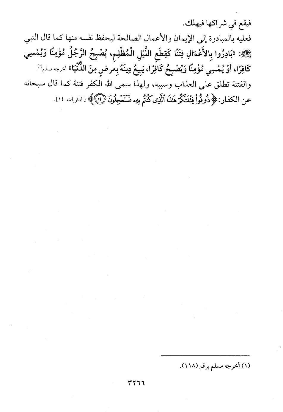 فعليه بالمبادرة إلى الإيمان والأعمال الصالحة ليحفظ نفسه منها كما قال النبي - صلى الله عليه وسلم -: «بَادِرُوا بِالأَعْمَالِ فِتَنًا كَقِطَعِ اللَّيْلِ الْمُظْلِمِ، يُصْبِحُ الرَّجُلُ مُؤْمِنًا وَيُمْسِي كَافِرًا، أوْ يُمْسِي مُؤْمِنًا وَيُصْبِحُ كَافِرًا، يَبِيعُ دِينَهُ بِعرضٍ مِنَ الدٌُّنْيَا» أخرجه مسلم (¬1).