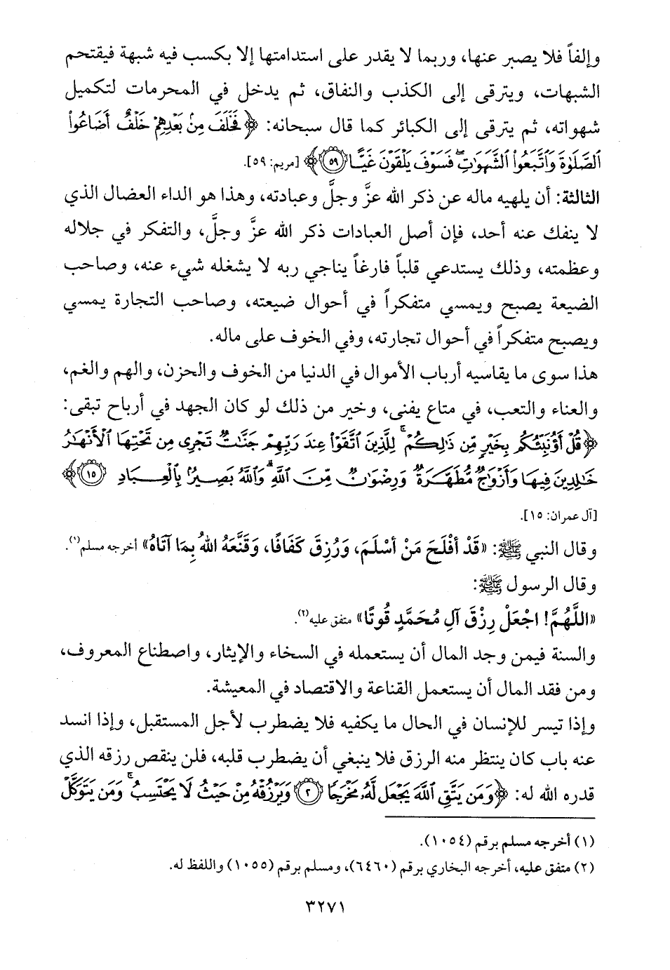 الثالثة: أن يلهيه ماله عن ذكر الله عزَّ وجلَّ وعبادته، وهذا هو الداء العضال الذي لا ينفك عنه أحد، فإن أصل العبادات ذكر الله عزَّ وجلَّ، والتفكر في جلاله وعظمته، وذلك يستدعي قلباً فارغاً يناجي ربه لا يشغله شيء عنه، وصاحب الضيعة يصبح ويمسي متفكراً في أحوال ضيعته، وصاحب التجارة يمسي ويصبح متفكراً في أحوال تجارته، وفي الخوف على ماله.