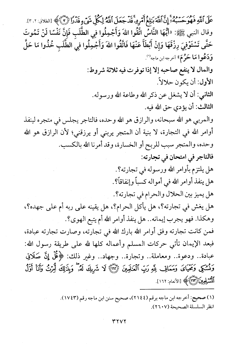 فمن كانت تجارته وفق أوامر الله بارك الله في تجارته، وصارت تجارته عبادة، فبعد الإيمان تأتي حركات المسلم وأعماله كلها لله على طريقة رسول الله: عبادة .. ودعوة .. ومعاملة .. وتجارة .. وجهاد .. وغير ذلك: {قُلْ إِنَّ صَلَاتِي وَنُسُكِي وَمَحْيَايَ وَمَمَاتِي لِلَّهِ رَبِّ الْعَالَمِينَ (162) لَا شَرِيكَ لَهُ وَبِذَلِكَ أُمِرْتُ وَأَنَا أَوَّلُ الْمُسْلِمِينَ (163)} [الأنعام: 162].