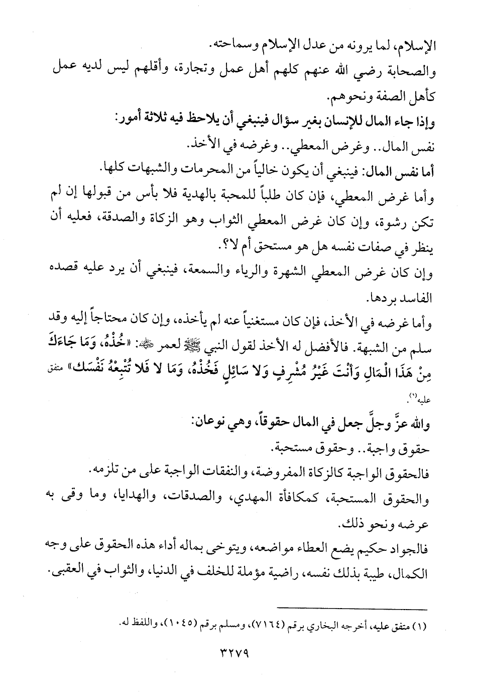 وإذا جاء المال للإنسان بغير سؤال فينبغي أن يلاحظ فيه ثلاثة أمور: