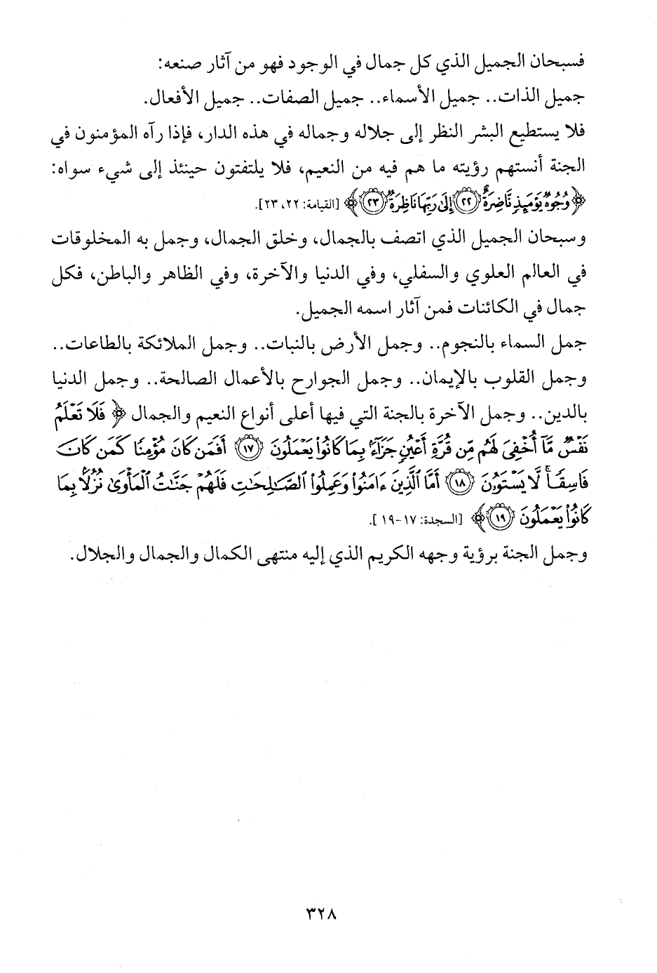 جمل السماء بالنجوم .. وجمل الأرض بالنبات .. وجمل الملائكة بالطاعات .. وجمل القلوب بالإيمان .. وجمل الجوارح بالأعمال الصالحة .. وجمل الدنيا بالدين .. وجمل الآخرة بالجنة التي فيها أعلى أنواع النعيم والجمال {فَلَا تَعْلَمُ نَفْسٌ مَا أُخْفِيَ لَهُمْ مِنْ قُرَّةِ أَعْيُنٍ جَزَاءً بِمَا كَانُوا يَعْمَلُونَ (17) أَفَمَنْ كَانَ مُؤْمِنًا كَمَنْ كَانَ فَاسِقًا لَا يَسْتَوُونَ (18) أَمَّا الَّذِينَ آمَنُوا وَعَمِلُوا الصَّالِحَاتِ فَلَهُمْ جَنَّاتُ الْمَأْوَى نُزُلًا بِمَا كَانُوا يَعْمَلُونَ (19)} [السجدة: 17 - 19].