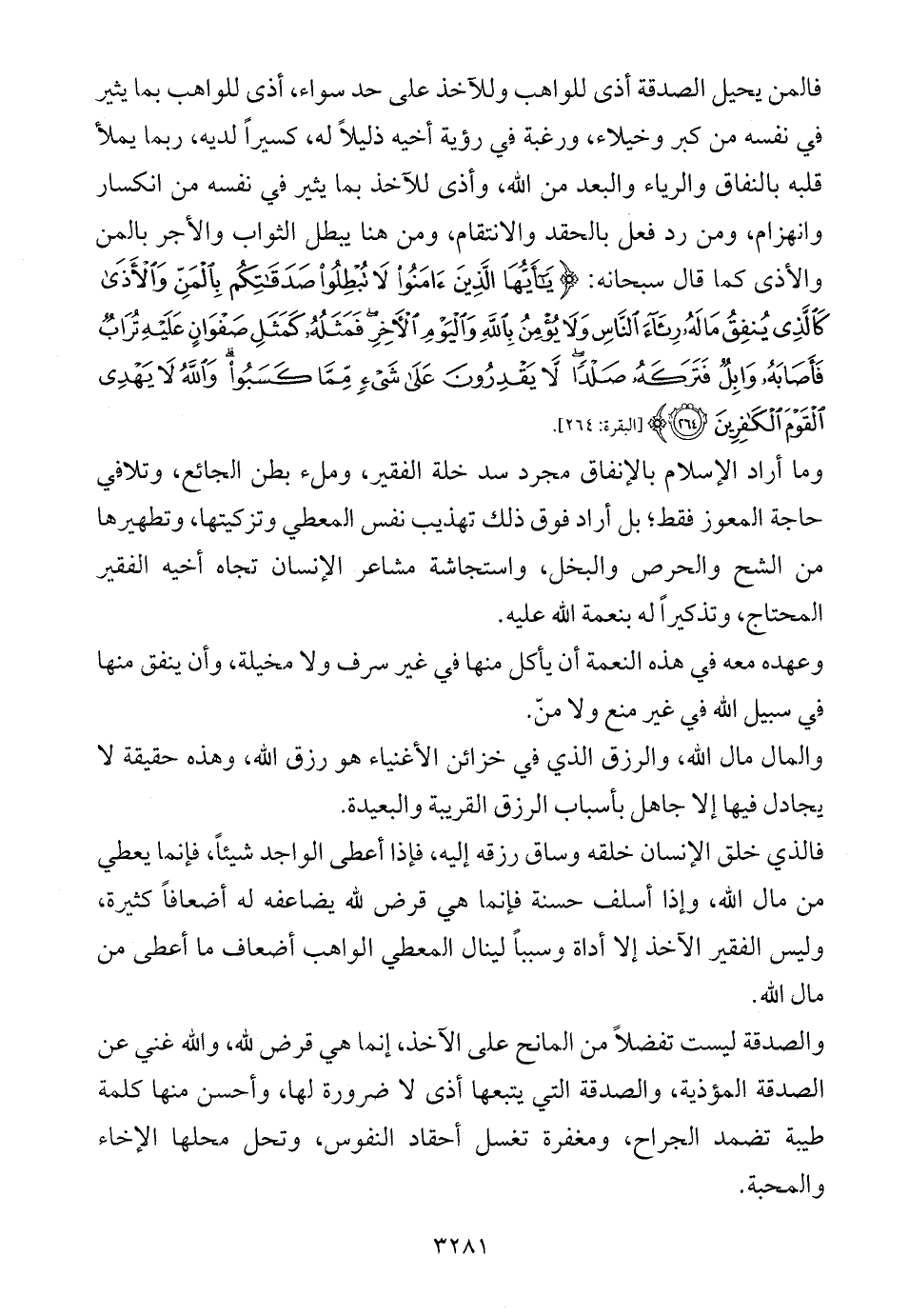 والصدقة ليست تفضلاً من المانح على الآخذ، إنما هي قرض لله، والله غني عن الصدقة المؤذية، والصدقة التي يتبعها أذى لا ضرورة لها، وأحسن منها كلمة طيبة تضمد الجراح، ومغفرة تغسل أحقاد النفوس، وتحل محلها الإخاء والمحبة.