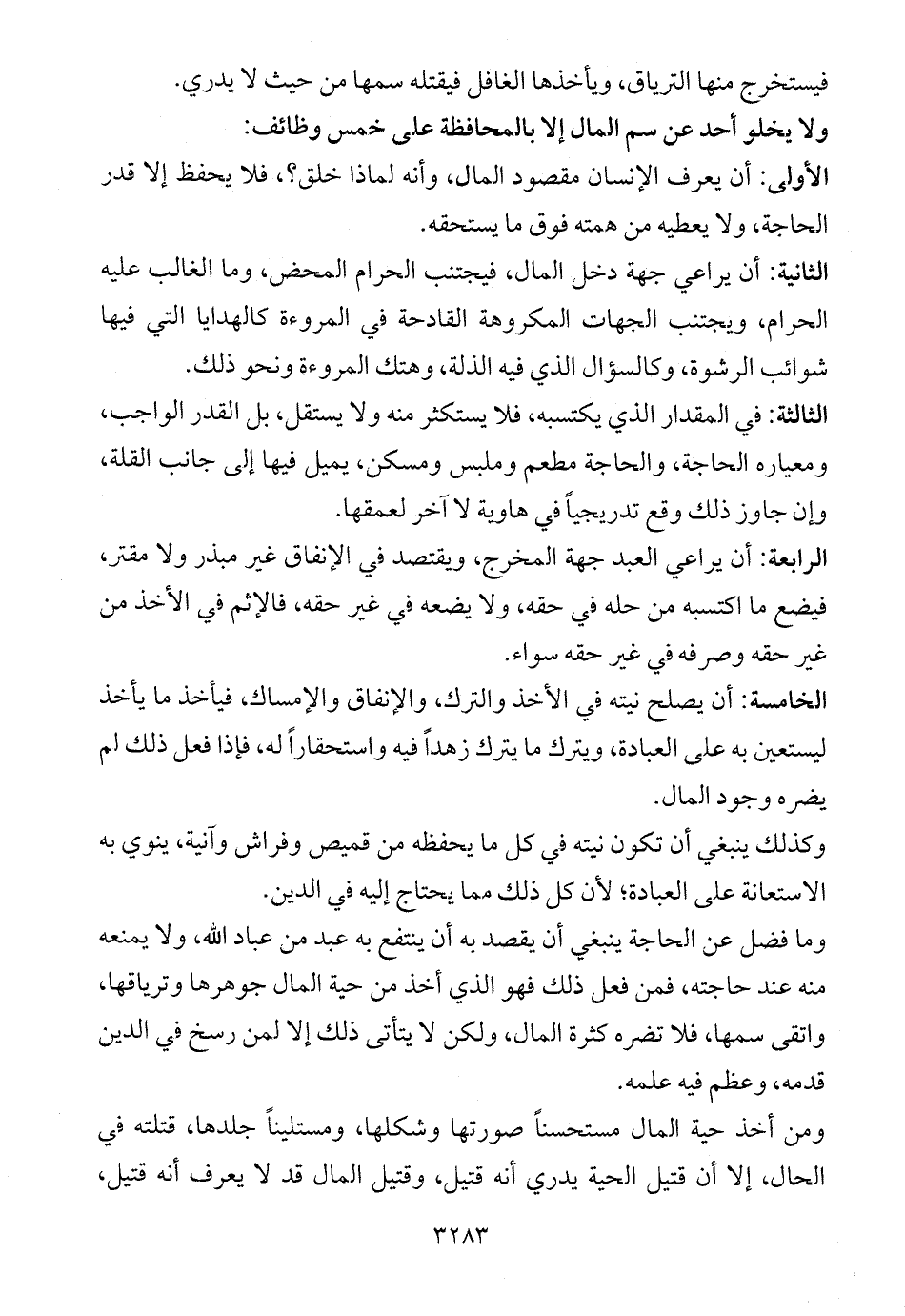 ولا يخلو أحد عن سم المال إلا بالمحافظة على خمس وظائف: