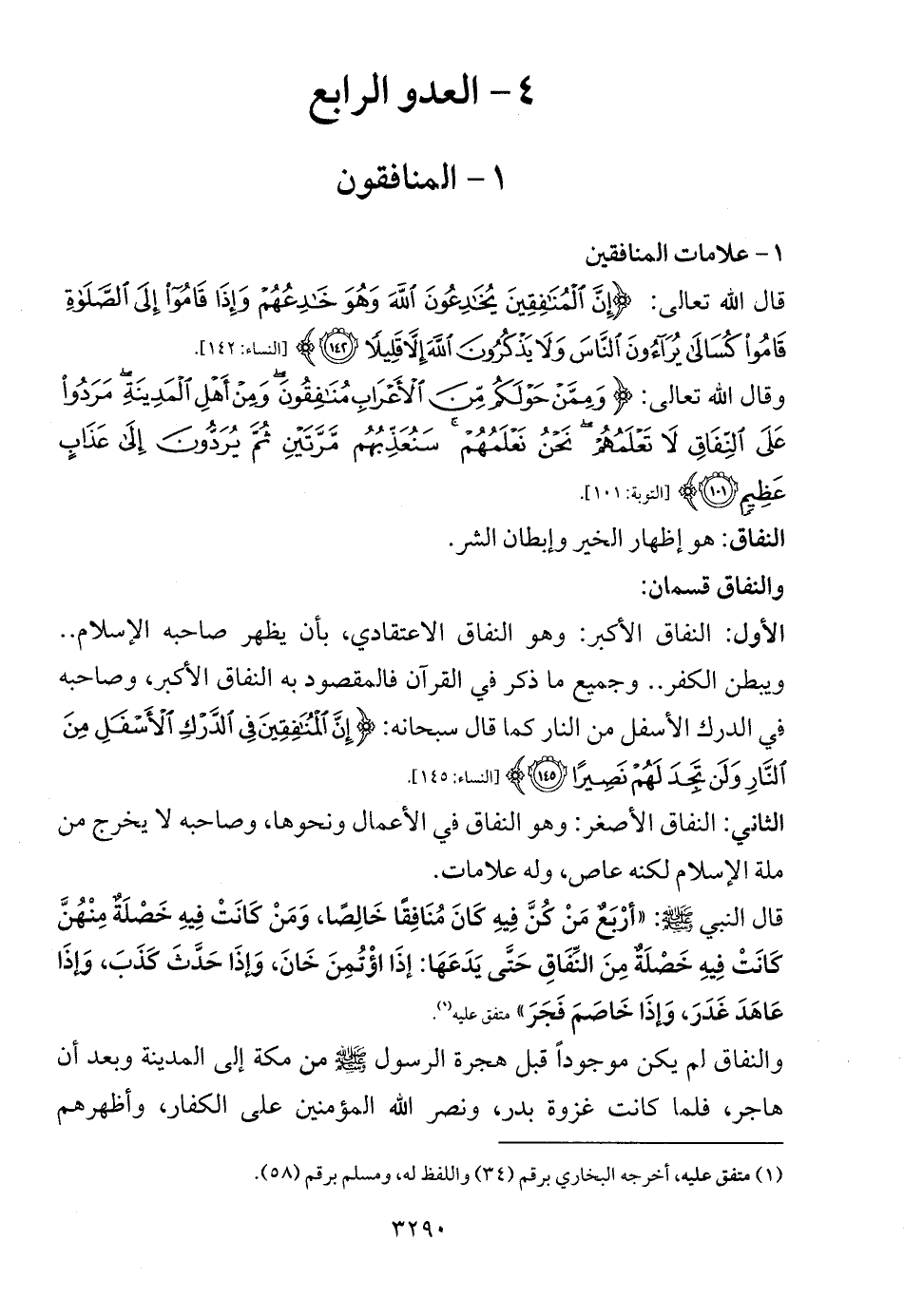 الثاني: النفاق الأصغر: وهو النفاق في الأعمال ونحوها، وصاحبه لا يخرج من ملة الإسلام لكنه عاص، وله علامات.