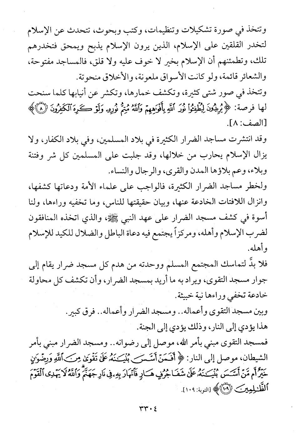 فلا بدَّ لتماسك المجتمع المسلم ووحدته من هدم كل مسجد ضرار يقام إلى جوار مسجد التقوى، ويراد به ما أريد بمسجد الضرار، وأن تكشف كل محاولة خادعة تخفي وراءها نية خبيثة.