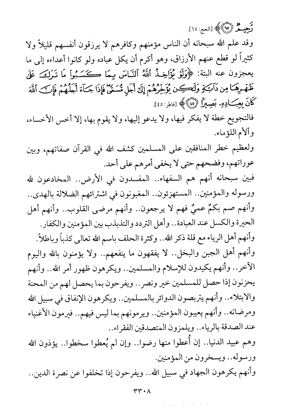 وأنهم أهل الجبن والبخل .. لا يفقهون ما ينفعهم .. ولا يؤمنون بالله واليوم الآخر .. وأنهم يكيدون للإسلام والمسلمين .. ويكرهون ظهور أمر الله .. وأنهم يحزنون إذا حصل للمسلمين خير ونصر .. ويفرحون بما يحصل لهم من المحنة والابتلاء .. وأنهم يتربصون الدوائر بالمسلمين .. ويكرهون الإنفاق في سبيل الله ومرضاته .. وأنهم يعيبون المؤمنين .. ويرمونهم بما ليس فيهم .. فيرمون الأغنياء عند الصدقة بالرياء .. ويلمزون المتصدقين الفقراء ..
