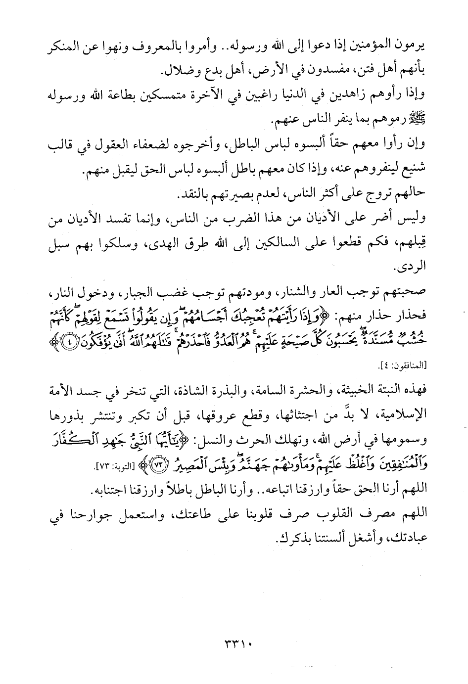 فهذه النبتة الخبيثة، والحشرة السامة، والبذرة الشاذة، التي تنخر في جسد الأمة الإسلامية، لا بدَّ من اجتثاثها، وقطع عروقها، قبل أن تكبر وتنتشر بذورها وسمومها في أرض الله، وتهلك الحرث والنسل: {يَاأَيُّهَا النَّبِيُّ جَاهِدِ الْكُفَّارَ وَالْمُنَافِقِينَ وَاغْلُظْ عَلَيْهِمْ وَمَأْوَاهُمْ جَهَنَّمُ وَبِئْسَ الْمَصِيرُ (73)} [التوبة: 73].