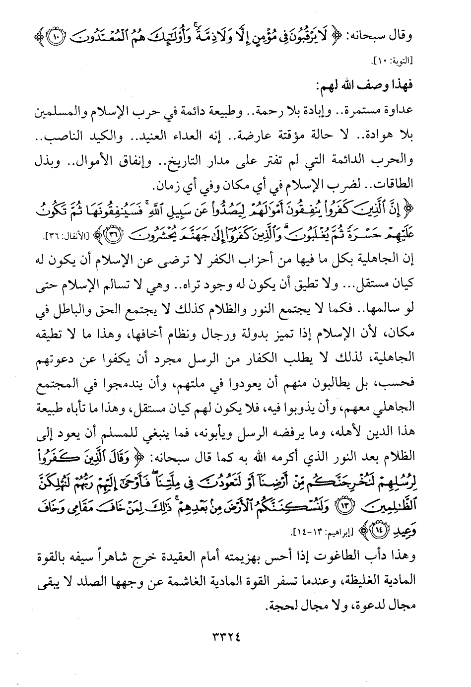 إن الجاهلية بكل ما فيها من أحزاب الكفر لا ترضى عن الإسلام أن يكون له كيان مستقل ... ولا تطيق أن يكون له وجود تراه .. وهي لا تسالم الإسلام حتى لو سالمها .. فكما لا يجتمع النور والظلام كذلك لا يجتمع الحق والباطل في مكان، لأن الإسلام إذا تميز بدولة ورجال ونظام أخافها، وهذا ما لا تطيقه الجاهلية، لذلك لا يطلب الكفار من الرسل مجرد أن يكفوا عن دعوتهم فحسب، بل يطالبون منهم أن يعودوا في ملتهم، وأن يندمجوا في المجتمع الجاهلي معهم، وأن يذوبوا فيه، فلا يكون لهم كيان مستقل، وهذا ما تأباه طبيعة هذا الدين لأهله، وما يرفضه الرسل ويأبونه، فما ينبغي للمسلم أن يعود إلى الظلام بعد النور الذي أكرمه الله به كما قال سبحانه: {وَقَالَ الَّذِينَ كَفَرُوا لِرُسُلِهِمْ لَنُخْرِجَنَّكُمْ مِنْ أَرْضِنَا أَوْ لَتَعُودُنَّ فِي مِلَّتِنَا فَأَوْحَى إِلَيْهِمْ رَبُّهُمْ لَنُهْلِكَنَّ الظَّالِمِينَ (13) وَلَنُسْكِنَنَّكُمُ الْأَرْضَ مِنْ بَعْدِهِمْ ذَلِكَ لِمَنْ خَافَ مَقَامِي وَخَافَ وَعِيدِ (14)} ... [إبراهيم: 13 - 14].