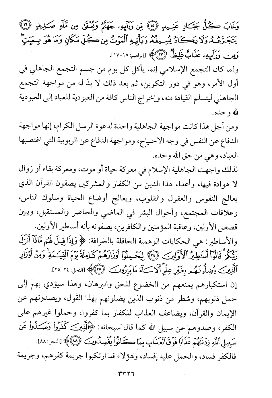 لذلك واجهت الجاهلية الإسلام في معركة حياة أو موت، ومعركة بقاء أو زوال لا هوادة فيها، وأعداء هذا الدين من الكفار والمشركين يصفون القرآن الذي يعالج النفوس والعقول والقلوب، ويعالج أوضاع الحياة وسلوك الناس، وعلاقات المجتمع، وأحوال البشر في الماضي والحاضر والمستقبل، ويبين قصص الأولين، وعاقبة المؤمنين والكافرين، يصفونه بأنه أساطير الأولين.