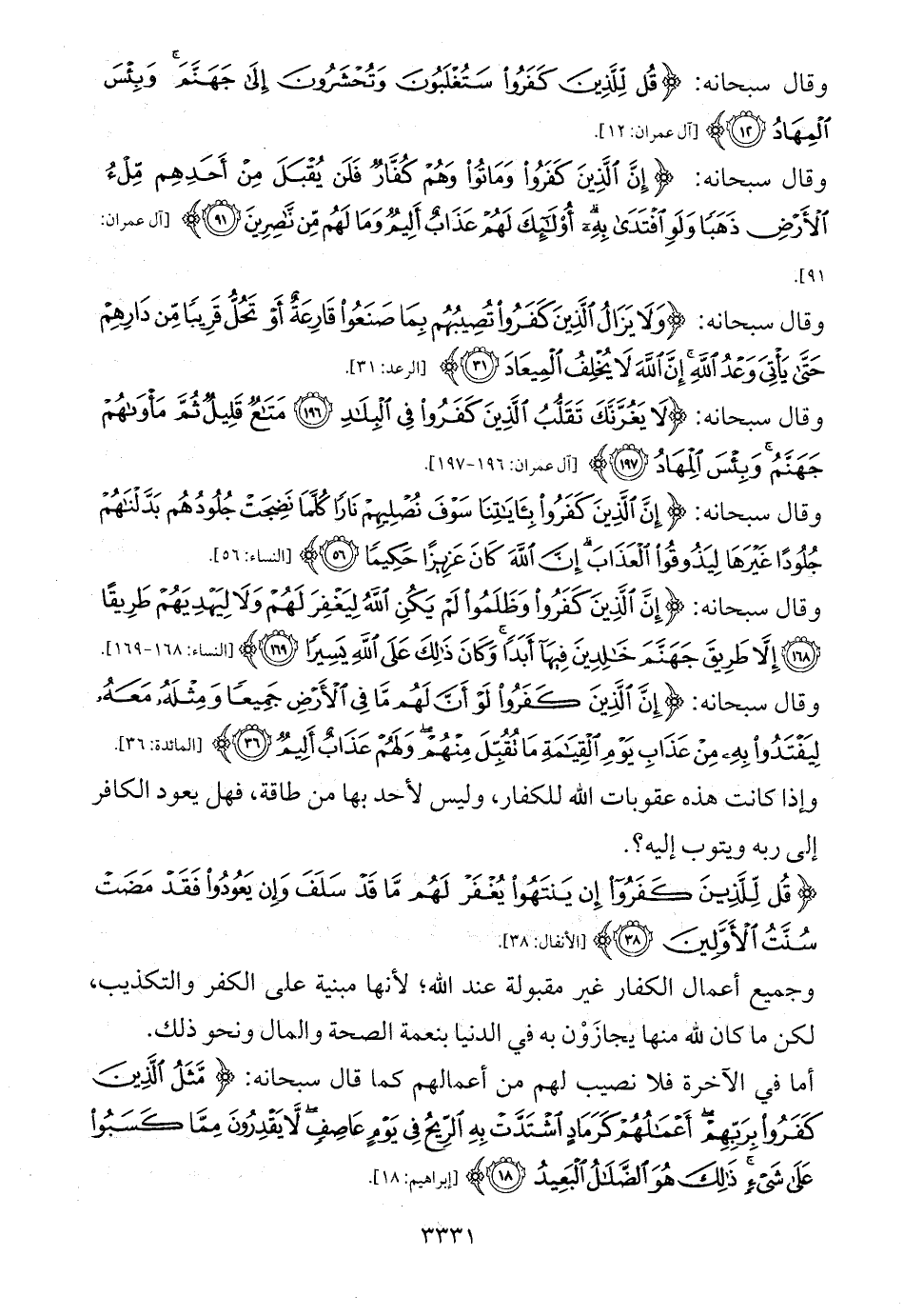 وقال سبحانه: {إِنَّ الَّذِينَ كَفَرُوا وَمَاتُوا وَهُمْ كُفَّارٌ فَلَنْ يُقْبَلَ مِنْ أَحَدِهِمْ مِلْءُ الْأَرْضِ ذَهَبًا وَلَوِ افْتَدَى بِهِ أُولَئِكَ لَهُمْ عَذَابٌ أَلِيمٌ وَمَا لَهُمْ مِنْ نَاصِرِينَ (91)} ... [آل عمران: 91].
