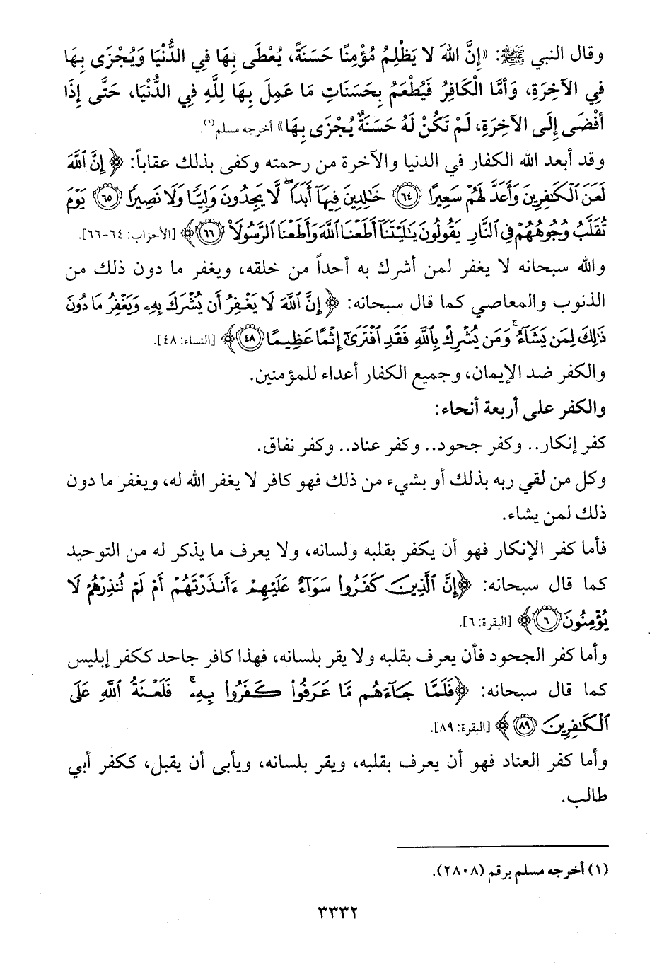 فأما كفر الإنكار فهو أن يكفر بقلبه ولسانه، ولا يعرف ما يذكر له من التوحيد كما قال سبحانه: {إِنَّ الَّذِينَ كَفَرُوا سَوَاءٌ عَلَيْهِمْ أَأَنْذَرْتَهُمْ أَمْ لَمْ تُنْذِرْهُمْ لَا يُؤْمِنُونَ (6)} [البقرة: 6].