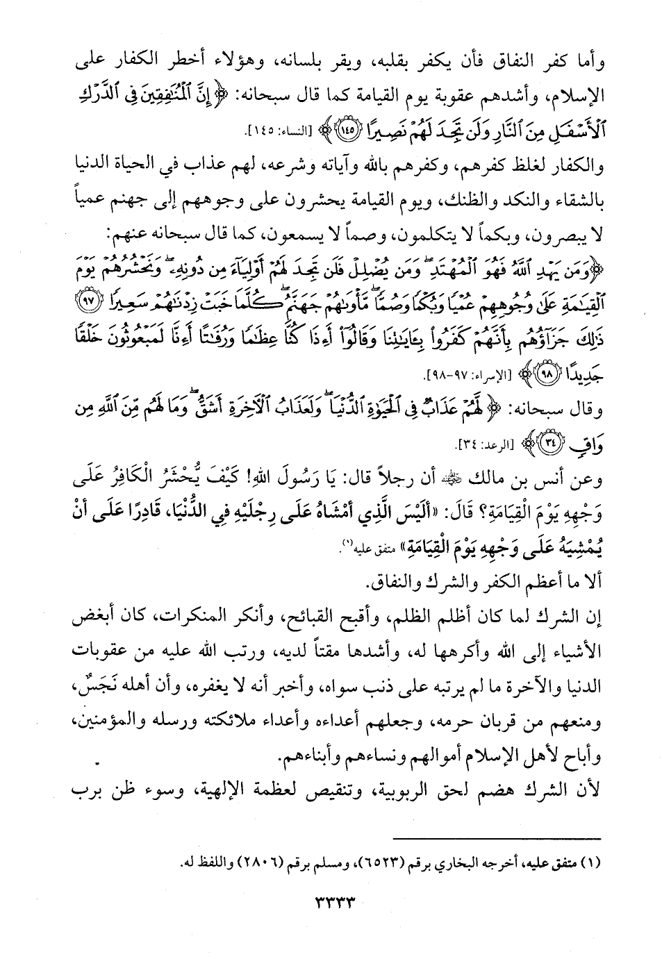 إن الشرك لما كان أظلم الظلم، وأقبح القبائح، وأنكر المنكرات، كان أبغض الأشياء إلى الله وأكرهها له، وأشدها مقتاً لديه، ورتب الله عليه من عقوبات الدنيا والآخرة ما لم يرتبه على ذنب سواه، وأخبر أنه لا يغفره، وأن أهله نَجَسٌ، ومنعهم من قربان حرمه، وجعلهم أعداءه وأعداء ملائكته ورسله والمؤمنين، وأباح لأهل الإسلام أموالهم ونساءهم وأبناءهم.