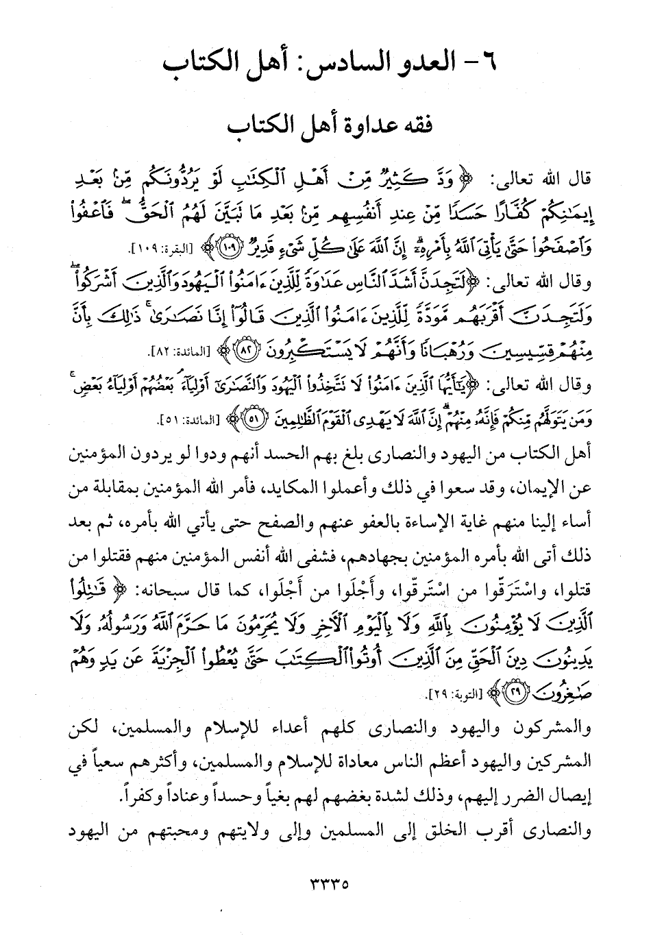 أهل الكتاب من اليهود والنصارى بلغ بهم الحسد أنهم ودوا لو يردون المؤمنين عن الإيمان، وقد سعوا في ذلك وأعملوا المكايد، فأمر الله المؤمنين بمقابلة من أساء إلينا منهم غاية الإساءة بالعفو عنهم والصفح حتى يأتي الله بأمره، ثم بعد ذلك أتى الله بأمره المؤمنين بجهادهم، فشفى الله أنفس المؤمنين منهم فقتلوا من قتلوا، واسْتَرَقّوا من اسْتَرقّوا، وأَجْلَوا من أَجْلَوا، كما قال سبحانه: {قَاتِلُوا الَّذِينَ لَا يُؤْمِنُونَ بِاللَّهِ وَلَا بِالْيَوْمِ الْآخِرِ وَلَا يُحَرِّمُونَ مَا حَرَّمَ اللَّهُ وَرَسُولُهُ وَلَا يَدِينُونَ دِينَ الْحَقِّ مِنَ الَّذِينَ أُوتُوا الْكِتَابَ حَتَّى يُعْطُوا الْجِزْيَةَ عَنْ يَدٍ وَهُمْ صَاغِرُونَ (29)} [التوبة: 29].