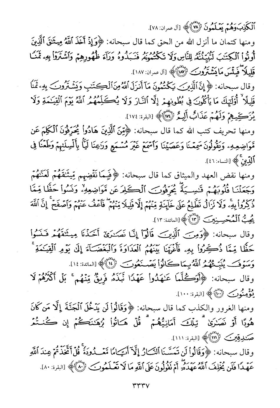 ومنها كتمان ما أنزل الله من الحق كما قال سبحانه: {وَإِذْ أَخَذَ اللَّهُ مِيثَاقَ الَّذِينَ أُوتُوا الْكِتَابَ لَتُبَيِّنُنَّهُ لِلنَّاسِ وَلَا تَكْتُمُونَهُ فَنَبَذُوهُ وَرَاءَ ظُهُورِهِمْ وَاشْتَرَوْا بِهِ ثَمَنًا قَلِيلًا فَبِئْسَ مَا يَشْتَرُونَ (187)} [آل عمران: 187].