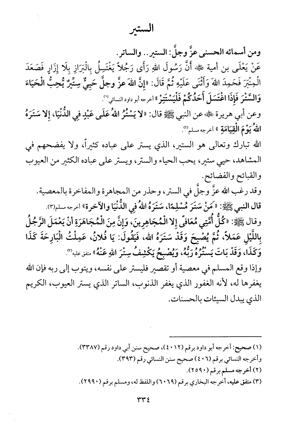 الله تبارك وتعالى هو الستير، الذي يستر على عباده كثيراً، ولا يفضحهم في المشاهد، حيي ستير، يحب الحياء والستر، ويستر على عباده الكثير من العيوب والقبائح والفضائح.