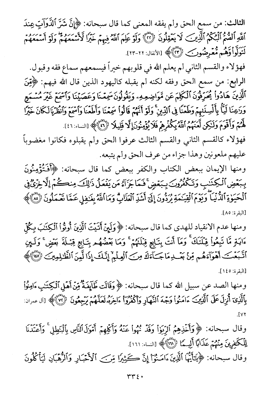الثالث: من سمع الحق ولم يفقه المعنى كما قال سبحانه: {إِنَّ شَرَّ الدَّوَابِّ عِنْدَ اللَّهِ الصُّمُّ الْبُكْمُ الَّذِينَ لَا يَعْقِلُونَ (22) وَلَوْ عَلِمَ اللَّهُ فِيهِمْ خَيْرًا لَأَسْمَعَهُمْ وَلَوْ أَسْمَعَهُمْ لَتَوَلَّوْا وَهُمْ مُعْرِضُونَ (23)} ... [الأنفال: 22 - 23].