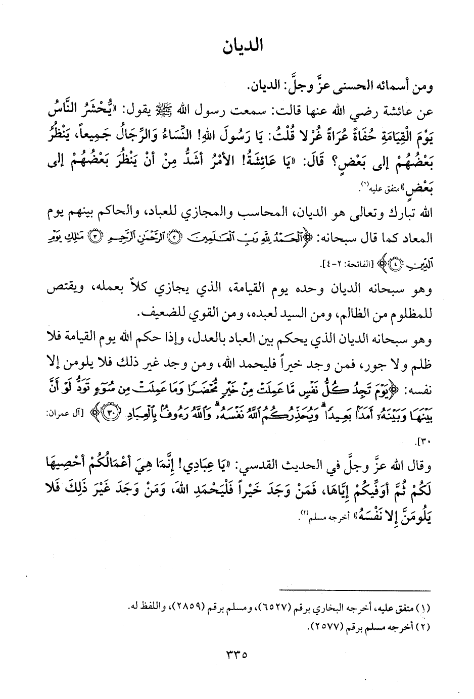 وهو سبحانه الديان الذي يحكم بين العباد بالعدل، وإذا حكم الله يوم القيامة فلا ظلم ولا جور، فمن وجد خيراً فليحمد الله، ومن وجد غير ذلك فلا يلومن إلا نفسه: {يَوْمَ تَجِدُ كُلُّ نَفْسٍ مَا عَمِلَتْ مِنْ خَيْرٍ مُحْضَرًا وَمَا عَمِلَتْ مِنْ سُوءٍ تَوَدُّ لَوْ أَنَّ بَيْنَهَا وَبَيْنَهُ أَمَدًا بَعِيدًا وَيُحَذِّرُكُمُ اللَّهُ نَفْسَهُ وَاللَّهُ رَءُوفٌ بِالْعِبَادِ (30)} [آل عمران: 30].