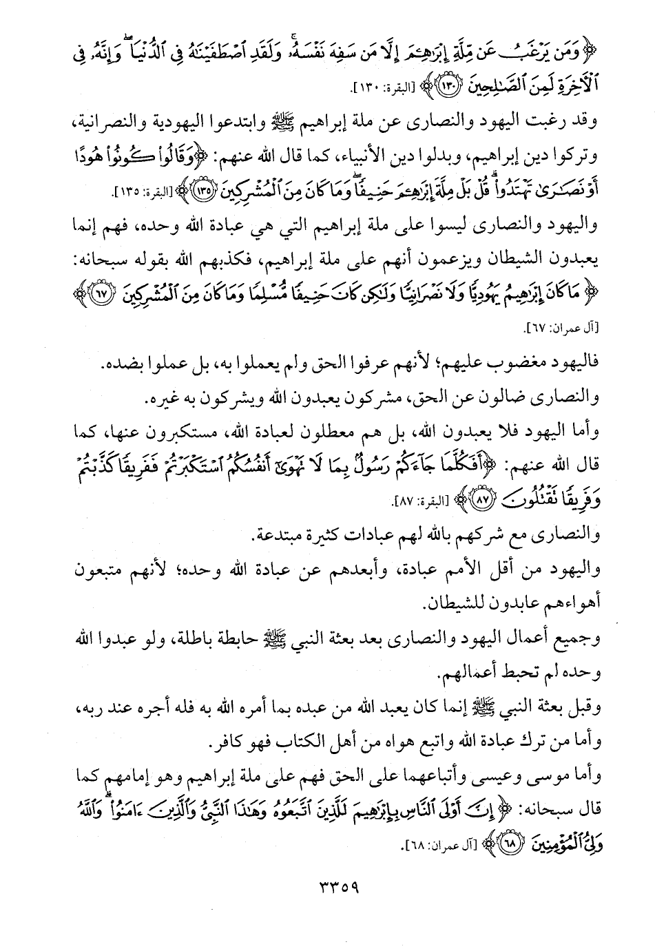 واليهود والنصارى ليسوا على ملة إبراهيم التي هي عبادة الله وحده، فهم إنما يعبدون الشيطان ويزعمون أنهم على ملة إبراهيم، فكذبهم الله بقوله سبحانه: {مَا كَانَ إِبْرَاهِيمُ يَهُودِيًّا وَلَا نَصْرَانِيًّا وَلَكِنْ كَانَ حَنِيفًا مُسْلِمًا وَمَا كَانَ مِنَ الْمُشْرِكِينَ (67)} [آل عمران: 67].