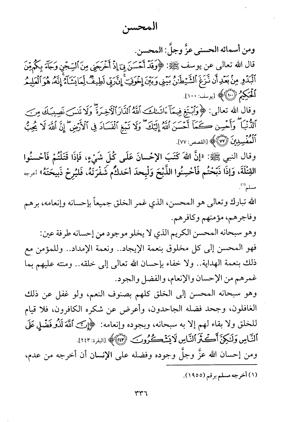 فهو المحسن إلى كل مخلوق بنعمة الإيجاد .. ونعمة الإمداد .. وللمؤمن مع ذلك بنعمة الهداية .. ولا خفاء بإحسان الله تعالى إلى خلقه .. ومنته عليهم بما غمرهم من الإحسان والإنعام، والفضل والجود.
