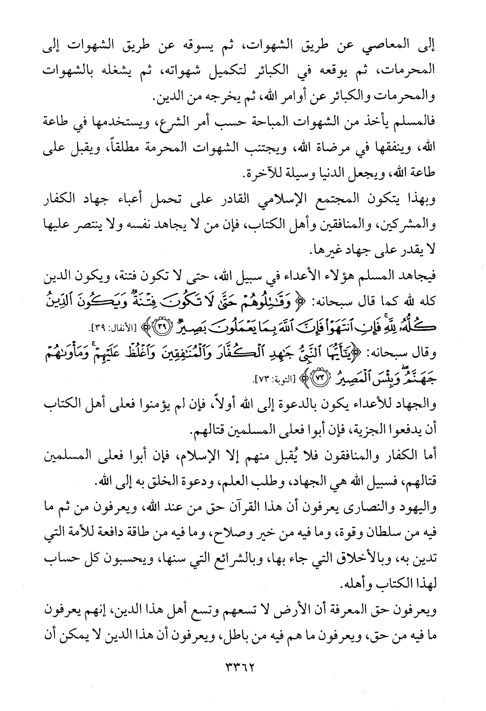 وبهذا يتكون المجتمع الإسلامي القادر على تحمل أعباء جهاد الكفار والمشركين، والمنافقين وأهل الكتاب، فإن من لا يجاهد نفسه ولا ينتصر عليها لا يقدر على جهاد غيرها.