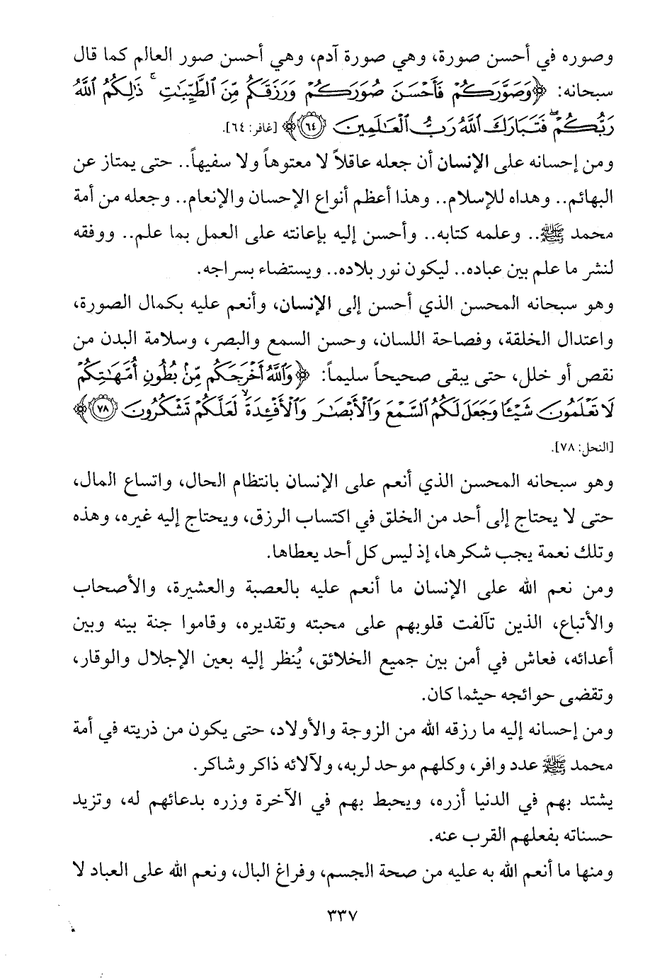 ومن إحسانه على الإنسان أن جعله عاقلاً لا معتوهاً ولا سفيهاً .. حتى يمتاز عن البهائم .. وهداه للإسلام .. وهذا أعظم أنواع الإحسان والإنعام .. وجعله من أمة محمد - صلى الله عليه وسلم - .. وعلمه كتابه .. وأحسن إليه بإعانته على العمل بما علم .. ووفقه لنشر ما علم بين عباده .. ليكون نور بلاده .. ويستضاء بسراجه.