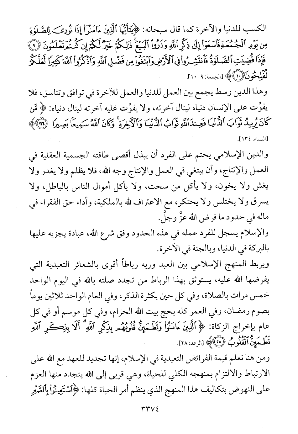 الكسب للدنيا والآخرة كما قال سبحانه: {يَاأَيُّهَا الَّذِينَ آمَنُوا إِذَا نُودِيَ لِلصَّلَاةِ مِنْ يَوْمِ الْجُمُعَةِ فَاسْعَوْا إِلَى ذِكْرِ اللَّهِ وَذَرُوا الْبَيْعَ ذَلِكُمْ خَيْرٌ لَكُمْ إِنْ كُنْتُمْ تَعْلَمُونَ (9) فَإِذَا قُضِيَتِ الصَّلَاةُ فَانْتَشِرُوا فِي الْأَرْضِ وَابْتَغُوا مِنْ فَضْلِ اللَّهِ وَاذْكُرُوا اللَّهَ كَثِيرًا لَعَلَّكُمْ تُفْلِحُونَ (10)} [الجمعة: 9 - 10].