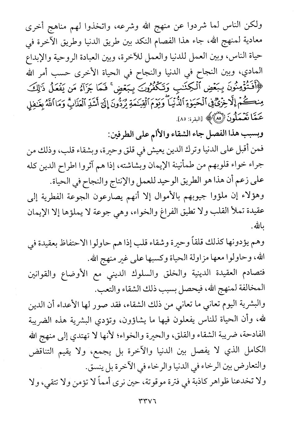 ولكن الناس لما شردوا عن منهج الله وشرعه، واتخذوا لهم مناهج أخرى معادية لمنهج الله، جاء هذا الفصام النكد بين طريق الدنيا وطريق الآخرة في حياة الناس، وبين العمل للدنيا والعمل للآخرة، وبين العبادة الروحية والإبداع المادي، وبين النجاح في الدنيا والنجاح في الحياة الأخرى حسب أمر الله {أَفَتُؤْمِنُونَ بِبَعْضِ الْكِتَابِ وَتَكْفُرُونَ بِبَعْضٍ فَمَا جَزَاءُ مَنْ يَفْعَلُ ذَلِكَ مِنْكُمْ إِلَّا خِزْيٌ فِي الْحَيَاةِ الدُّنْيَا وَيَوْمَ الْقِيَامَةِ يُرَدُّونَ إِلَى أَشَدِّ الْعَذَابِ وَمَا اللَّهُ بِغَافِلٍ عَمَّا تَعْمَلُونَ (85)} ... [البقرة: 85].