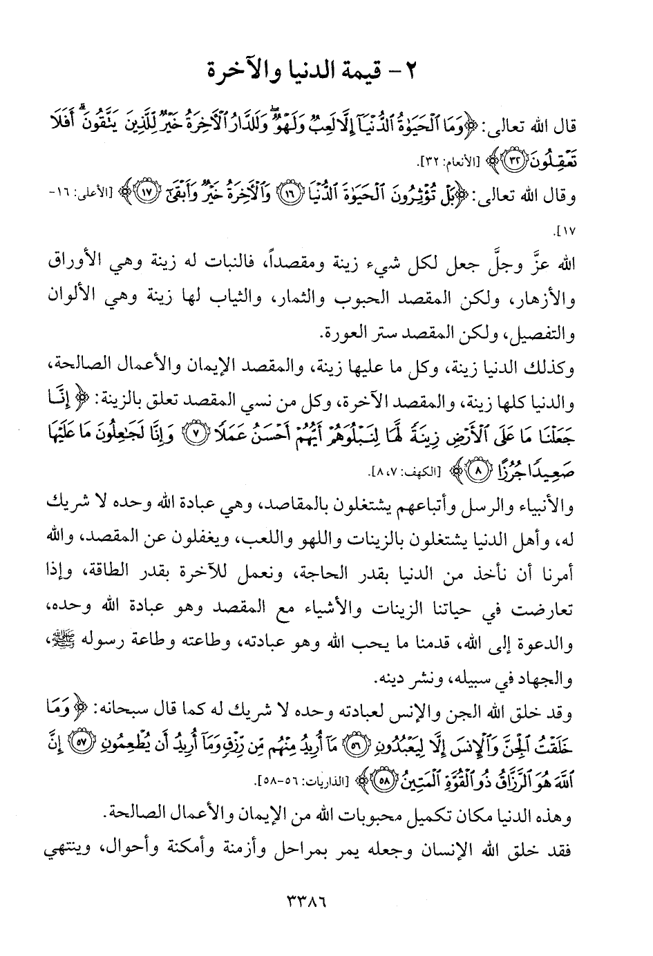 والأنبياء والرسل وأتباعهم يشتغلون بالمقاصد، وهي عبادة الله وحده لا شريك له، وأهل الدنيا يشتغلون بالزينات واللهو واللعب، ويغفلون عن المقصد، والله أمرنا أن نأخذ من الدنيا بقدر الحاجة، ونعمل للآخرة بقدر الطاقة، وإذا تعارضت في حياتنا الزينات والأشياء مع المقصد وهو عبادة الله وحده، والدعوة إلى الله، قدمنا ما يحب الله وهو عبادته، وطاعته وطاعة رسوله - صلى الله عليه وسلم -، والجهاد في سبيله، ونشر دينه.