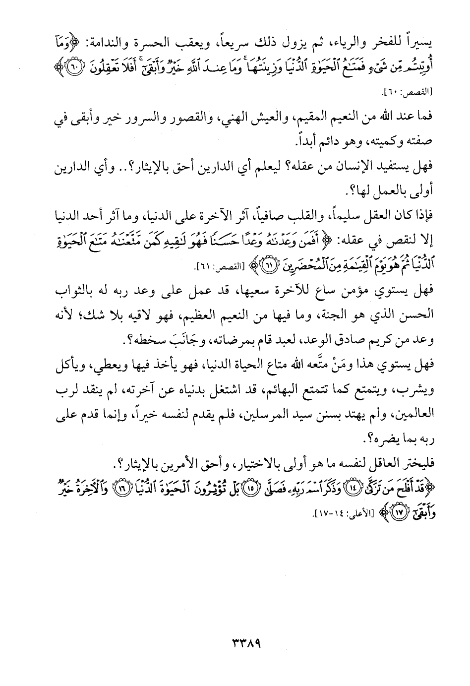 فإذا كان العقل سليماً، والقلب صافياً، آثر الآخرة على الدنيا، وما آثر أحد الدنيا إلا لنقص في عقله: {أَفَمَنْ وَعَدْنَاهُ وَعْدًا حَسَنًا فَهُوَ لَاقِيهِ كَمَنْ مَتَّعْنَاهُ مَتَاعَ الْحَيَاةِ الدُّنْيَا ثُمَّ هُوَ يَوْمَ الْقِيَامَةِ مِنَ الْمُحْضَرِينَ (61)} [القصص: 61].