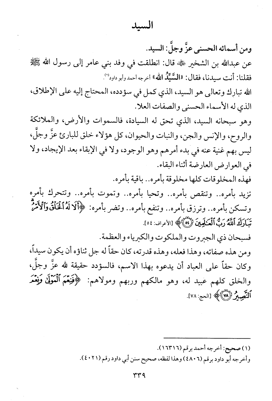 ومن هذه صفاته، وهذا فعله، وهذه قدرته، كان حقاً له جل ثناؤه أن يكون سيداً، وكان حقاً على العباد أن يدعوه بهذا الاسم، فالسؤدد حقيقة لله عزَّ وجلَّ، والخلق كلهم عبيد له، وهو مالكهم وربهم ومولاهم: {فَنِعْمَ الْمَوْلَى وَنِعْمَ النَّصِيرُ (78)} [الحج: 78].