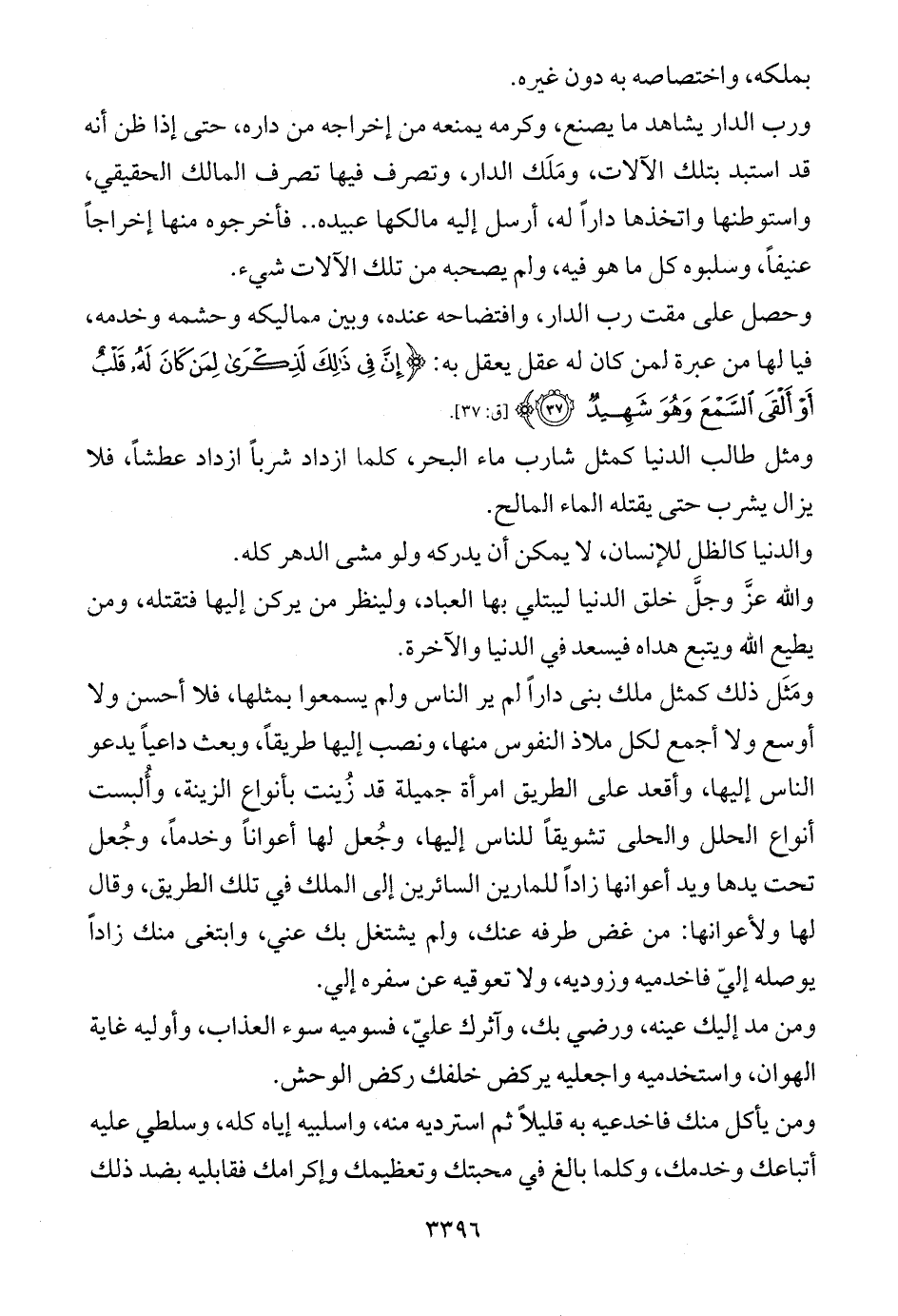 ومَثَل ذلك كمثل ملك بنى داراً لم ير الناس ولم يسمعوا بمثلها، فلا أحسن ولا أوسع ولا أجمع لكل ملاذ النفوس منها، ونصب إليها طريقاً، وبعث داعياً يدعو الناس إليها، وأقعد على الطريق امرأة جميلة قد زُينت بأنواع الزينة، وأُلبست أنواع الحلل والحلى تشويقاً للناس إليها، وجُعل لها أعواناً وخدماً، وجُعل تحت يدها ويد أعوانها زاداً للمارين السائرين إلى الملك في تلك الطريق، وقال لها ولأعوانها: من غض طرفه عنك، ولم يشتغل بك عني، وابتغى منك زاداً يوصله إليّ فاخدميه وزوديه، ولا تعوقيه عن سفره إلي.