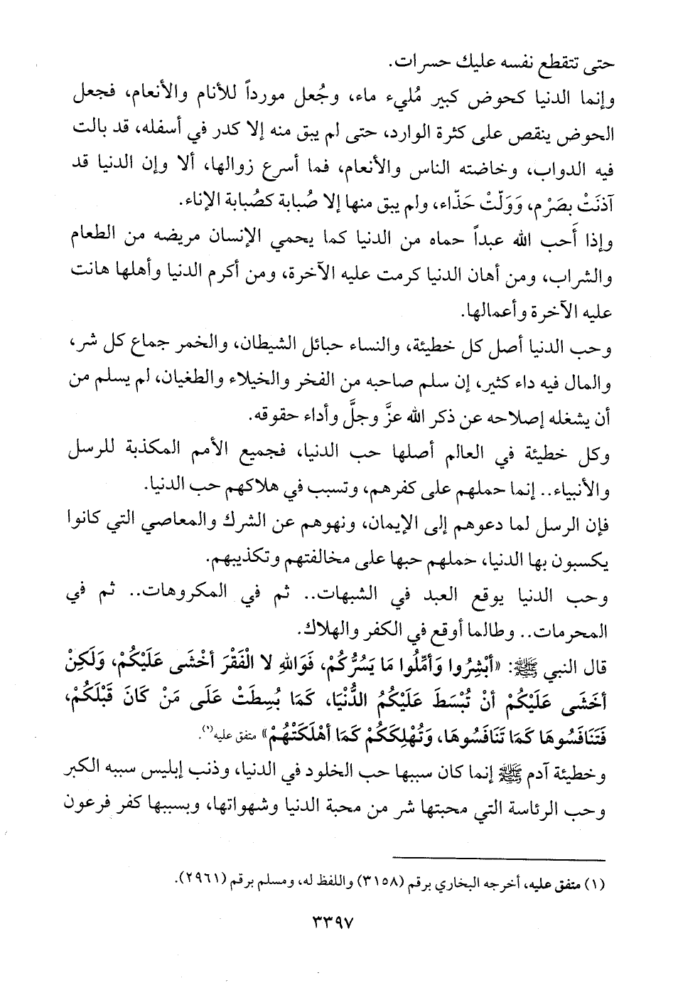 قال النبي - صلى الله عليه وسلم -: «أبْشِرُوا وَأمِّلُوا مَا يَسُرُّكُمْ، فَوَاللهِ لا الْفَقْرَ أخْشَى عَلَيْكُمْ، وَلَكِنْ أخَشَى عَلَيْكُمْ أنْ تُبْسَطَ عَلَيْكُمُ الدُّنْيَا، كَمَا بُسِطَتْ عَلَى مَنْ كَانَ قَبْلَكُمْ، فَتَنَافَسُوهَا كَمَا تَنَافَسُوهَا، وَتُهْلِكَكُمْ كَمَا أهْلَكَتْهُمْ» متفق عليه (¬1).