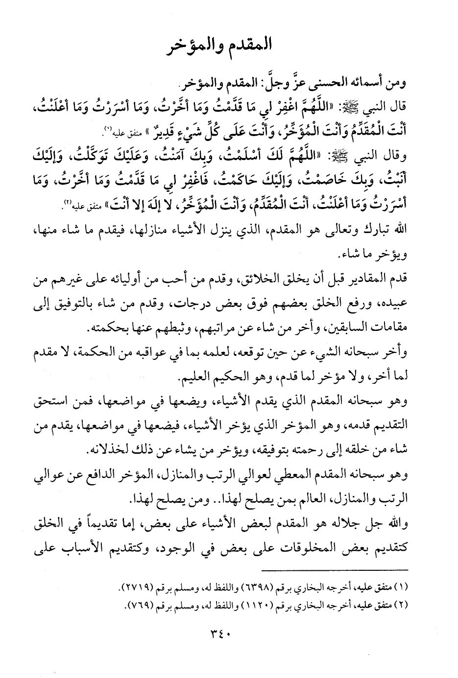 وهو سبحانه المقدم الذي يقدم الأشياء، ويضعها في مواضعها، فمن استحق التقديم قدمه، وهو المؤخر الذي يؤخر الأشياء، فيضعها في مواضعها، يقدم من شاء من خلقه إلى رحمته بتوفيقه، ويؤخر من يشاء عن ذلك لخذلانه.