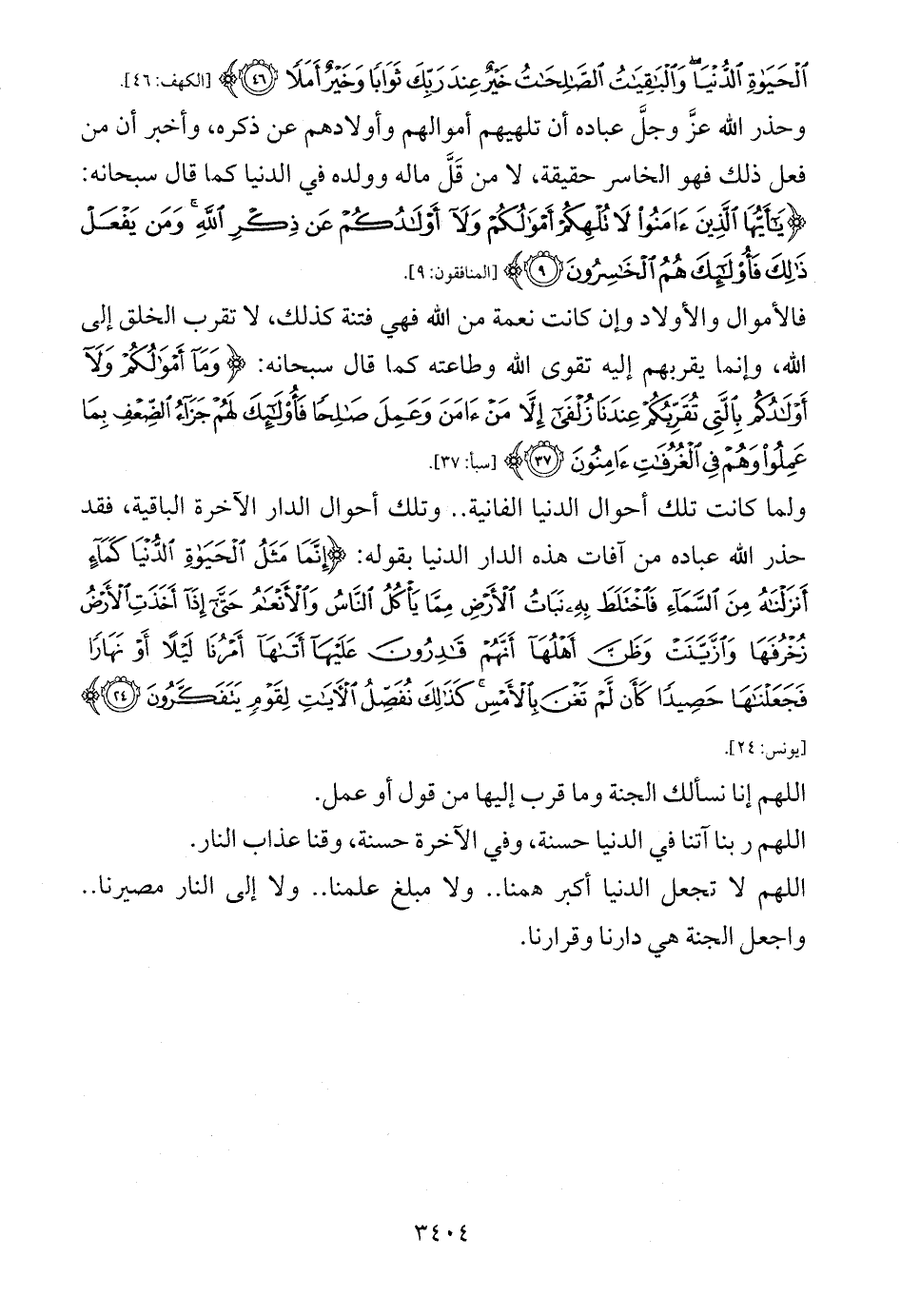 وحذر الله عزَّ وجلَّ عباده أن تلهيهم أموالهم وأولادهم عن ذكره، وأخبر أن من فعل ذلك فهو الخاسر حقيقة، لا من قَلَّ ماله وولده في الدنيا كما قال سبحانه: {يَاأَيُّهَا الَّذِينَ آمَنُوا لَا تُلْهِكُمْ أَمْوَالُكُمْ وَلَا أَوْلَادُكُمْ عَنْ ذِكْرِ اللَّهِ وَمَنْ يَفْعَلْ ذَلِكَ فَأُولَئِكَ هُمُ الْخَاسِرُونَ (9)} [المنافقون: 9].