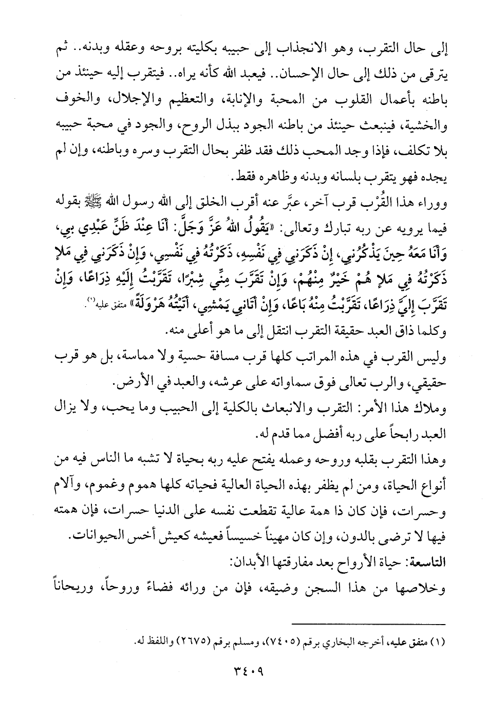 ووراء هذا القُرْب قرب آخر، عبَّر عنه أقرب الخلق إلى الله رسول الله - صلى الله عليه وسلم - بقوله فيما يرويه عن ربه تبارك وتعالى: «يَقُولُ اللهُ عَزَّ وَجَلَّ: أنَا عِنْدَ ظَنِّ عَبْدِي بِي، وَأنَا مَعَهُ حِينَ يَذْكُرُنِي، إِنْ ذَكَرَنِي فِي نَفْسِهِ، ذَكَرْتُهُ فِي نَفْسِي، وَإِنْ ذَكَرَنِي فِي مَلإ ذَكَرْتُهُ فِي مَلإ هُمْ خَيْرٌ مِنْهُمْ، وَإِنْ تَقَرَّبَ مِنِّي شِبْرًا، تَقَرَّبْتُ إِلَيْهِ ذِرَاعًا، وَإِنْ تَقَرَّبَ إِلَيَّ ذِرَاعًا، تَقَرَّبْتُ مِنْهُ بَاعًا، وَإِنْ أتَانِي يَمْشِي، أتَيْتُهُ هَرْوَلَةً» متفق عليه (¬1).