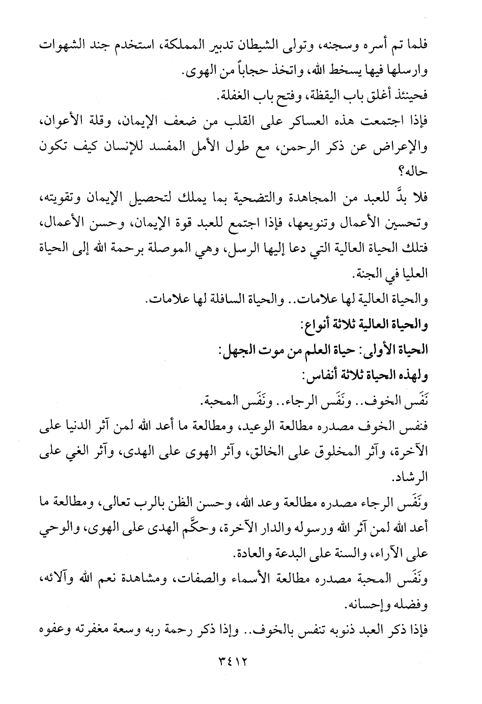فلا بدَّ للعبد من المجاهدة والتضحية بما يملك لتحصيل الإيمان وتقويته، وتحسين الأعمال وتنويعها، فإذا اجتمع للعبد قوة الإيمان، وحسن الأعمال، فتلك الحياة العالية التي دعا إليها الرسل، وهي الموصلة برحمة الله إلى الحياة العليا في الجنة.