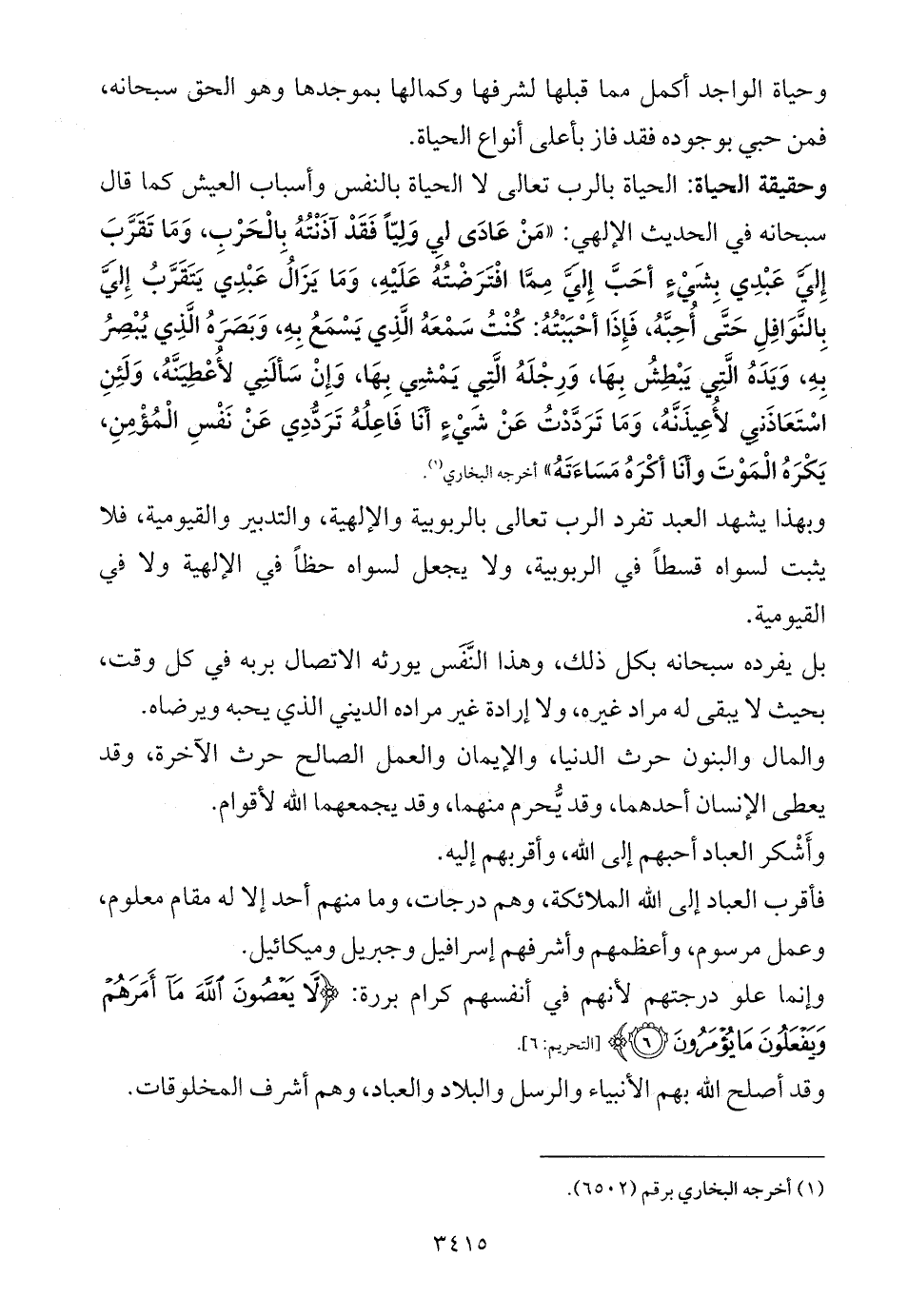 وحقيقة الحياة: الحياة بالرب تعالى لا الحياة بالنفس وأسباب العيش كما قال سبحانه في الحديث الإلهي: «مَنْ عَادَى لِي وَلِيّاً فَقَدْ آذَنْتُهُ بِالْحَرْبِ، وَمَا تَقَرَّبَ إِلَيَّ عَبْدِي بِشَيْءٍ أحَبَّ إِلَيَّ مِمَّا افْتَرَضْتُهُ عَلَيْهِ، وَمَا يَزَالُ عَبْدِي يَتَقَرَّبُ إِلَيَّ بِالنَّوَافِلِ حَتَّى أُحِبَّهُ، فَإِذَا أحْبَبْتُهُ: كُنْتُ سَمْعَهُ الَّذِي يَسْمَعُ بِهِ، وَبَصَرَهُ الَّذِي يُبْصِرُ بِهِ، وَيَدَهُ الَّتِي يَبْطِشُ بِهَا، وَرِجْلَهُ الَّتِي يَمْشِي بِهَا، وَإِنْ سَألَنِي لأُعْطِيَنَّهُ، وَلَئِنِ اسْتَعَاذَنِي لأُعِيذَنَّهُ، وَمَا تَرَدَّدْتُ عَنْ شَيْءٍ أنَا فَاعِلُهُ تَرَدُّدِي عَنْ نَفْسِ الْمُؤْمِنِ، يَكْرَهُ الْمَوْتَ وأنَا أكْرَهُ مَسَاءَتَهُ» أخرجه البخاري (¬1).