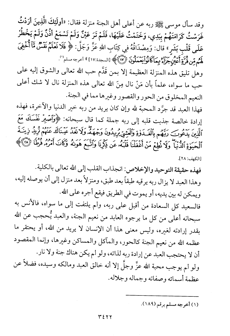 فالسعيد كل السعادة من أقبل على ربه، ولم يلتفت إلى ما سواه، فالأنس به سبحانه أعلى من كل ما يرجوه العابد من نعيم الجنة، والعبد يُّحجب عن الله بقدر إرادته لغيره، وليس معنى هذا أن الإنسان لا يريد من الله، أو يحتقر ما عظمه الله من نعيم الجنة كالحور، والمآكل والمساكن وغيرها، وإنما المقصود أن لا يحتجب العبد عن إرادة ربه لذاته، ولو لم يكن هناك جنة ولا نار.