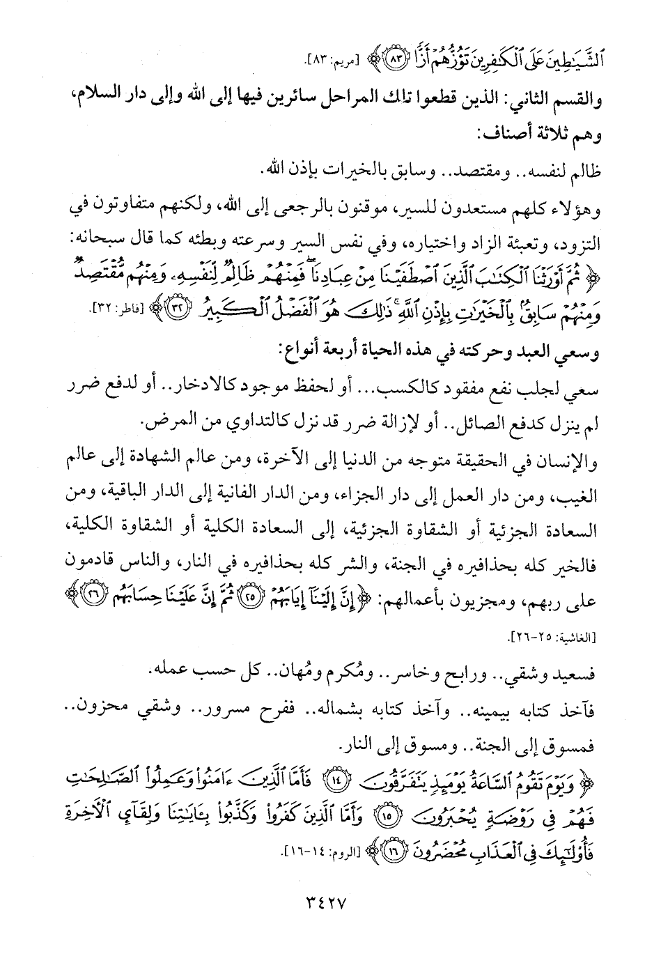 والقسم الثاني: الذين قطعوا تلك المراحل سائرين فيها إلى الله وإلى دار السلام، وهم ثلاثة أصناف: