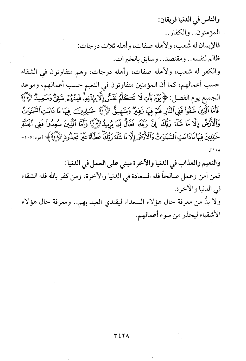 والكفر له شعب، ولأهله صفات، وأهله درجات، وهم متفاوتون في الشقاء حسب أعمالهم، كما أن المؤمنين متفاوتون في النعيم حسب أعمالهم، وموعد الجميع يوم الفصل: {يَوْمَ يَأْتِ لَا تَكَلَّمُ نَفْسٌ إِلَّا بِإِذْنِهِ فَمِنْهُمْ شَقِيٌّ وَسَعِيدٌ (105) فَأَمَّا الَّذِينَ شَقُوا فَفِي النَّارِ لَهُمْ فِيهَا زَفِيرٌ وَشَهِيقٌ (106) خَالِدِينَ فِيهَا مَا دَامَتِ السَّمَاوَاتُ وَالْأَرْضُ إِلَّا مَا شَاءَ رَبُّكَ إِنَّ رَبَّكَ فَعَّالٌ لِمَا يُرِيدُ (107) وَأَمَّا الَّذِينَ سُعِدُوا فَفِي الْجَنَّةِ خَالِدِينَ فِيهَا مَا دَامَتِ السَّمَاوَاتُ وَالْأَرْضُ إِلَّا مَا شَاءَ رَبُّكَ عَطَاءً غَيْرَ مَجْذُوذٍ (108)} [هود: 105 - 108].