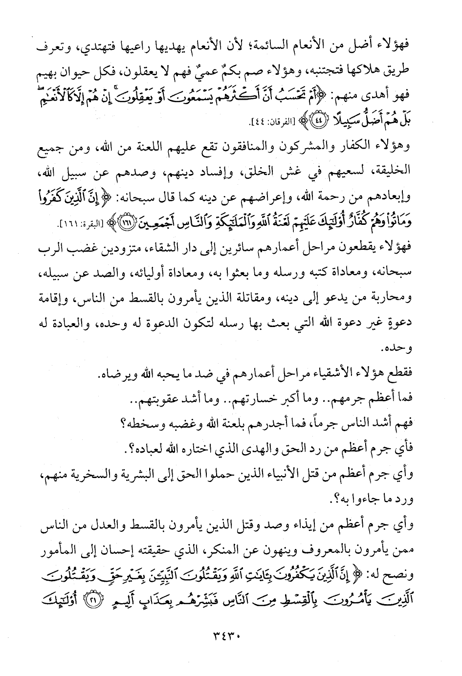 فهؤلاء أضل من الأنعام السائمة؛ لأن الأنعام يهديها راعيها فتهتدي، وتعرف طريق هلاكها فتجتنبه، وهؤلاء صمٌّ بكمٌ عميٌ فهم لا يعقلون، فكل حيوان بهيم فهو أهدى منهم: {أَمْ تَحْسَبُ أَنَّ أَكْثَرَهُمْ يَسْمَعُونَ أَوْ يَعْقِلُونَ إِنْ هُمْ إِلَّا كَالْأَنْعَامِ بَلْ هُمْ أَضَلُّ سَبِيلًا (44)} [الفرقان: 44].