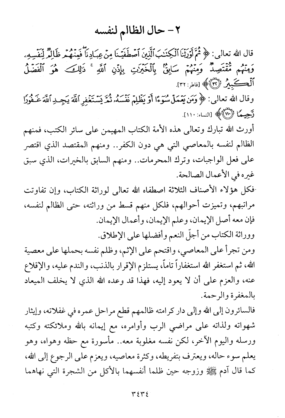 قال الله تعالى: {ثُمَّ أَوْرَثْنَا الْكِتَابَ الَّذِينَ اصْطَفَيْنَا مِنْ عِبَادِنَا فَمِنْهُمْ ظَالِمٌ لِنَفْسِهِ وَمِنْهُمْ مُقْتَصِدٌ وَمِنْهُمْ سَابِقٌ بِالْخَيْرَاتِ بِإِذْنِ اللَّهِ ذَلِكَ هُوَ الْفَضْلُ الْكَبِيرُ (32)} [فاطر: 32].